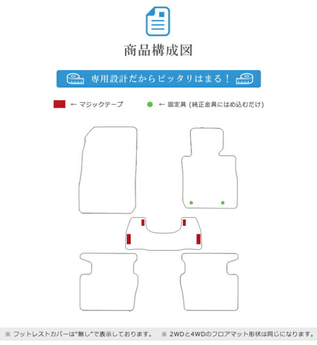 商品構成 専用フロアマット5枚(運転席 1枚 助手席 1枚 後部座席 3枚)
