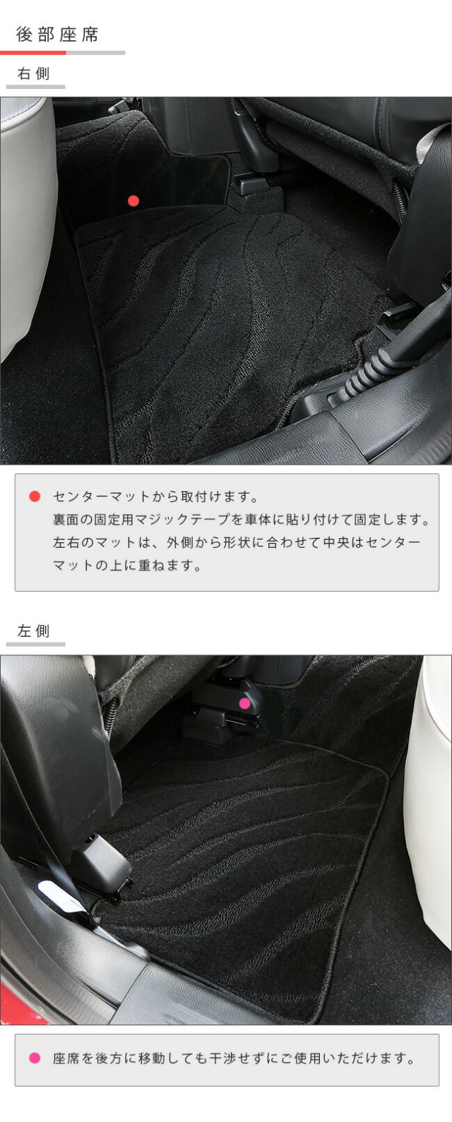 | 商品構成 | フロントシート用 2枚 (運転席・助手席) リアシート用 3枚 (左右リア+リアセンターマット) ※ 付属品: フロアマット メンテナンス書 |