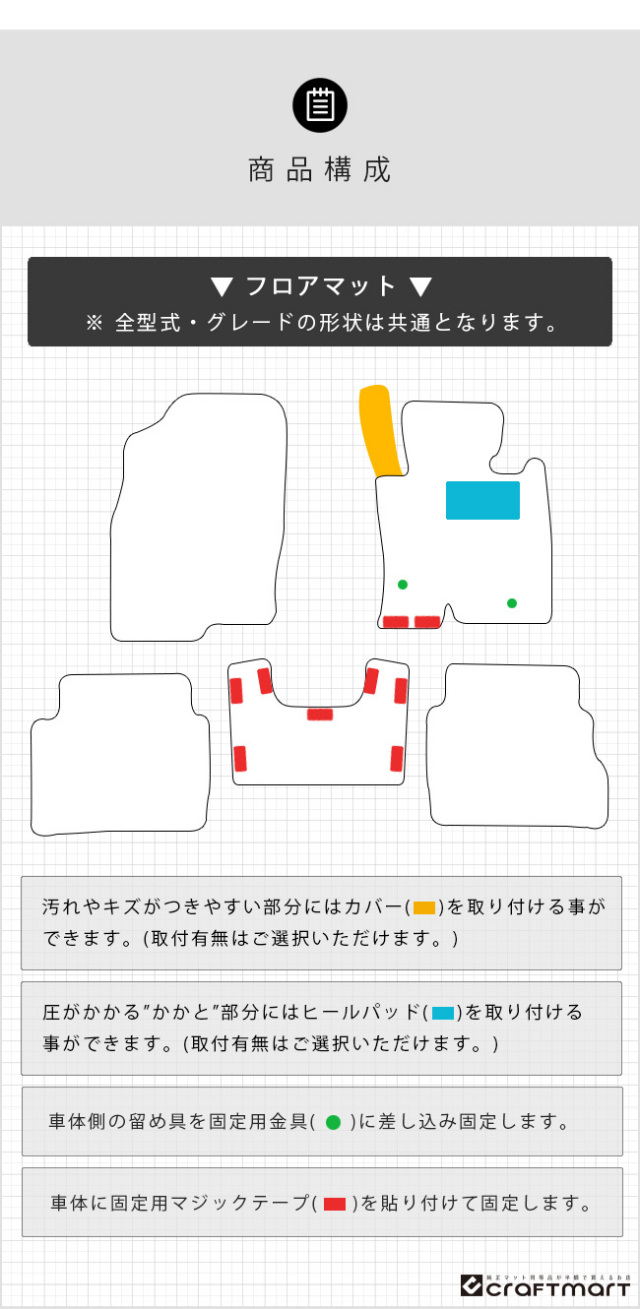 | 商品構成 | フロントシート用 2枚 (運転席・助手席) リアシート用 3枚 (左右リア+リアセンターマット) ※ 付属品: フロアマット メンテナンス書 |