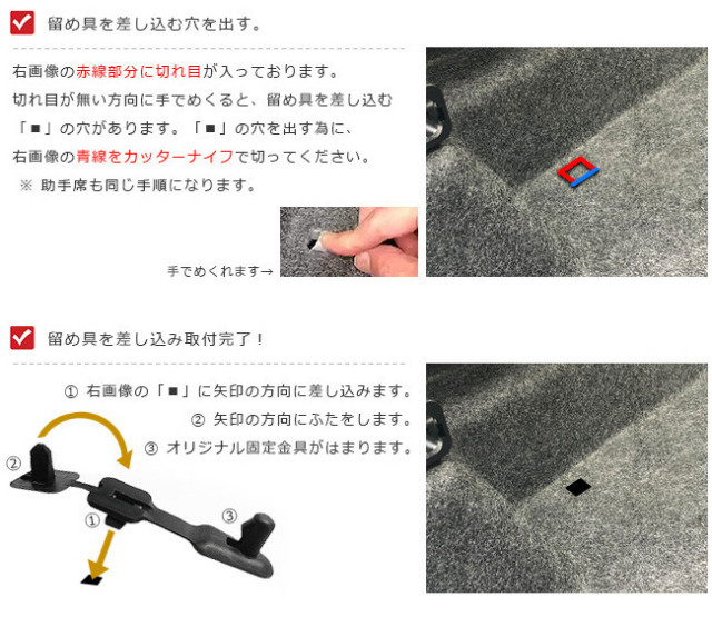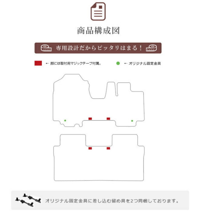 | 商品構成 | 専用フロアマット合計2枚 ・フロント用1枚 (フットレスト付) ・リア用1枚 留め具2個 |