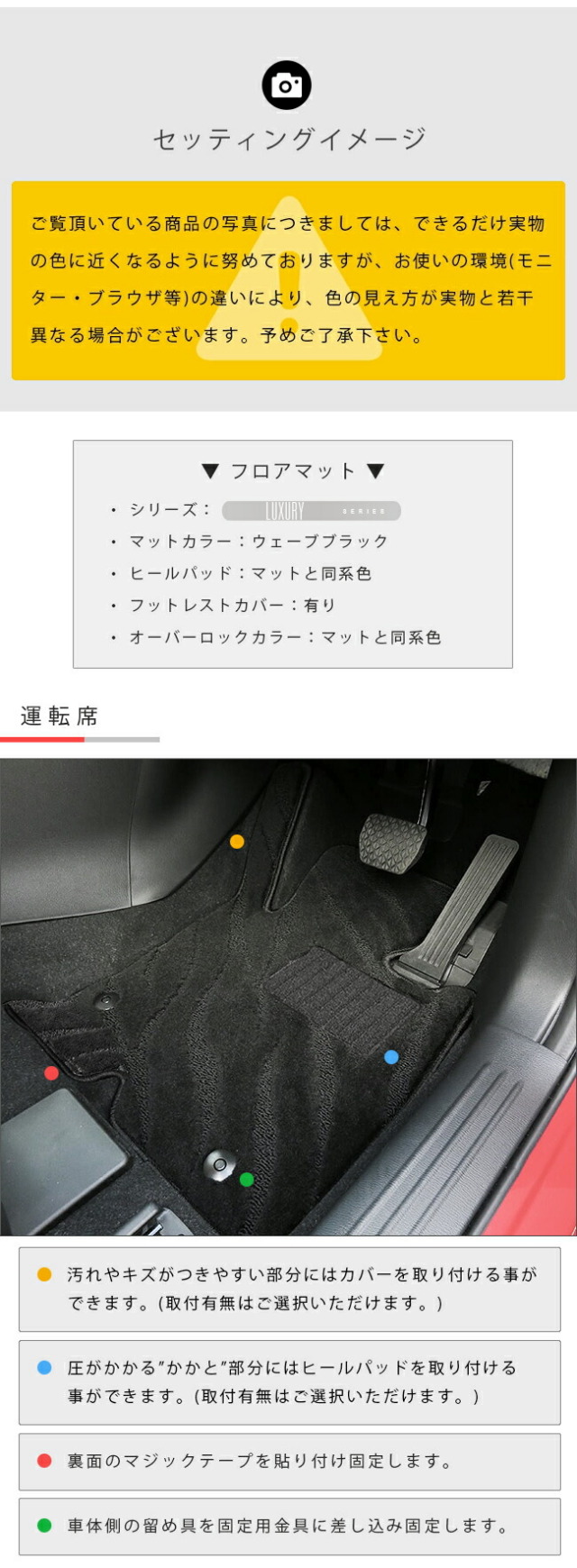 | 商品構成 | フロントシート用 2枚 (運転席・助手席) リアシート用 3枚 (左右リア+リアセンターマット) ラゲッジマット 3枚 ※ ラゲッジマットは年式により形状が異なります。ご購入の際は、適合年式をご選択ください。 |