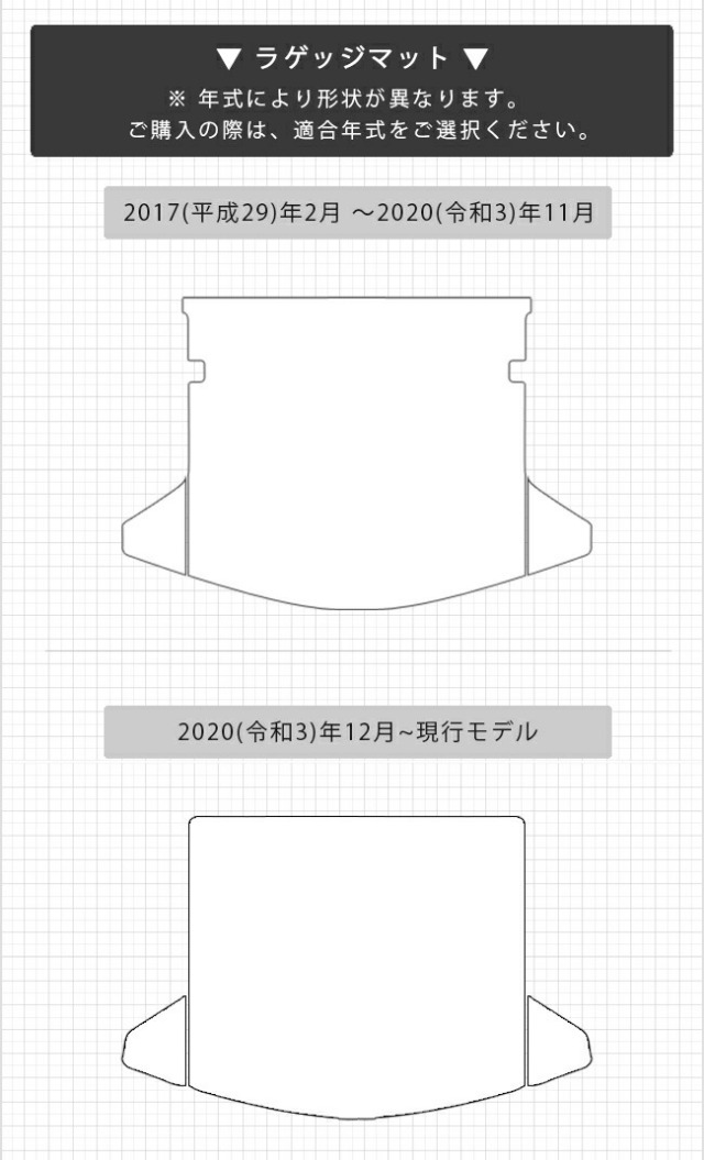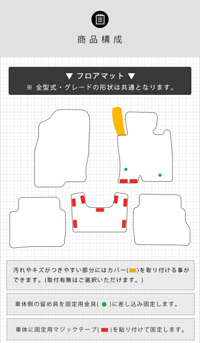 | 商品構成 | フロントシート用 2枚 (運転席・助手席) リアシート用 3枚 (左右リア+リアセンターマット) ラゲッジ(トランク)マット 3枚 ※ 付属品: フロアマット メンテナンス書 |