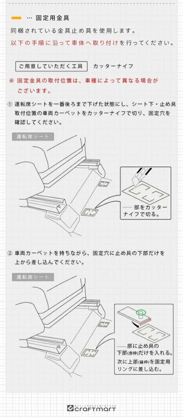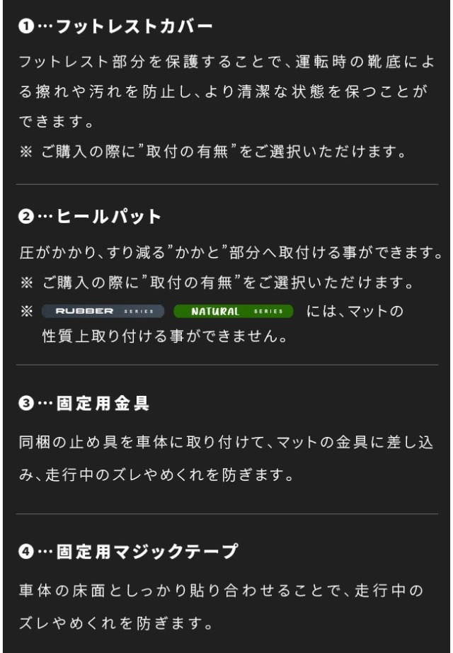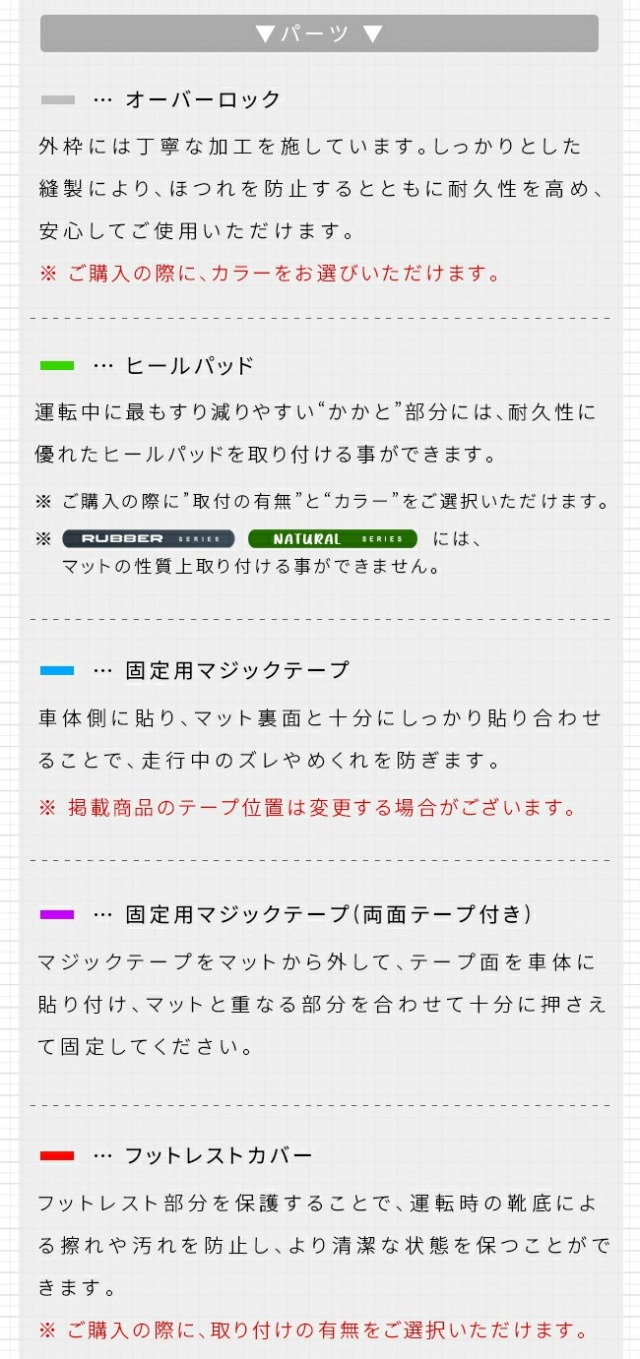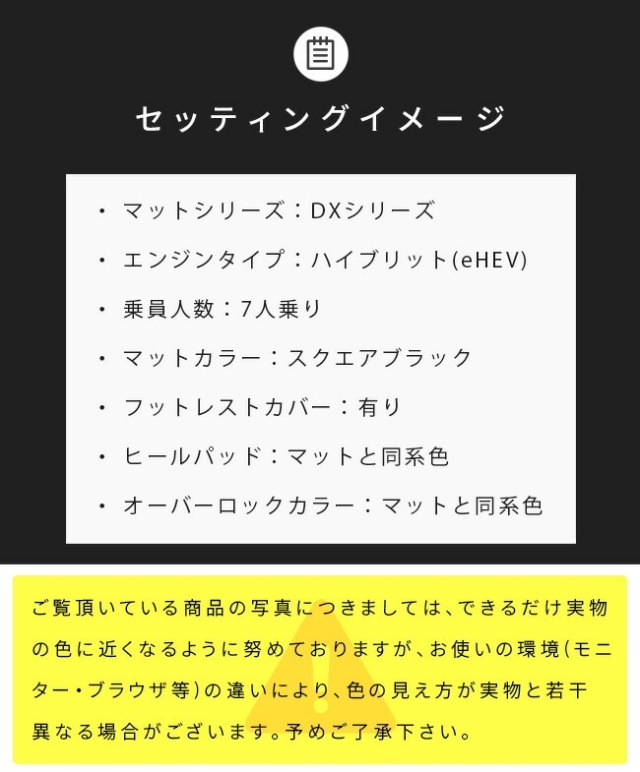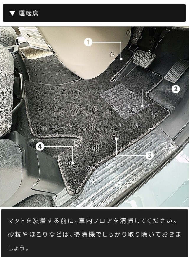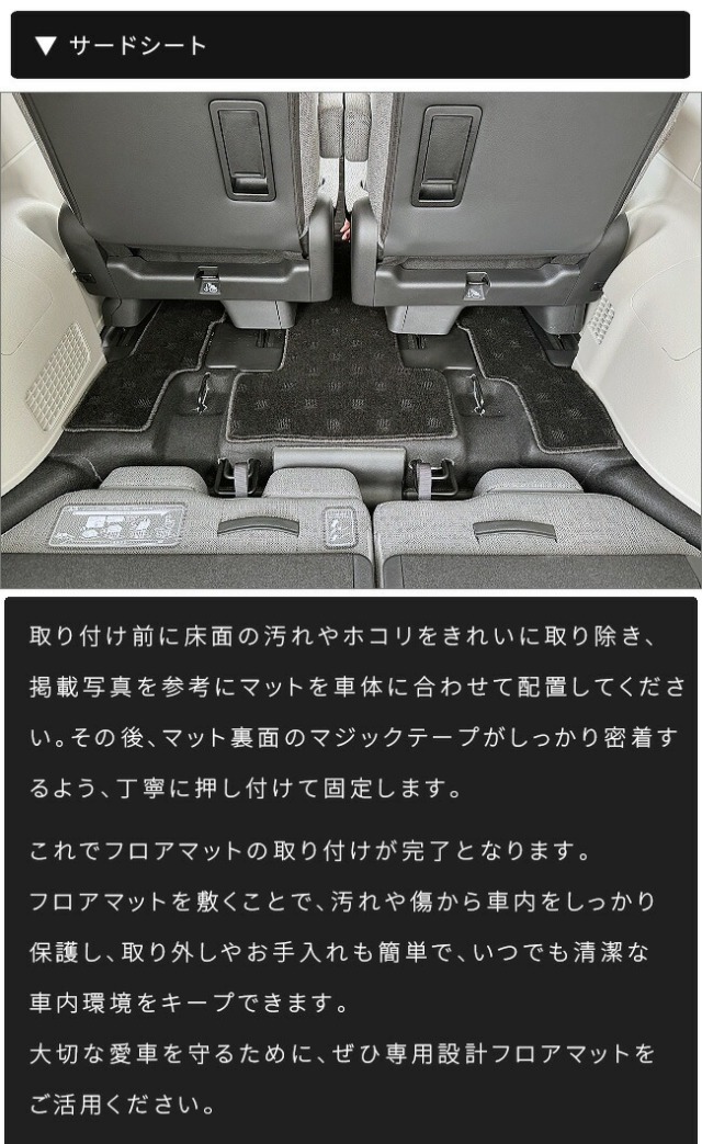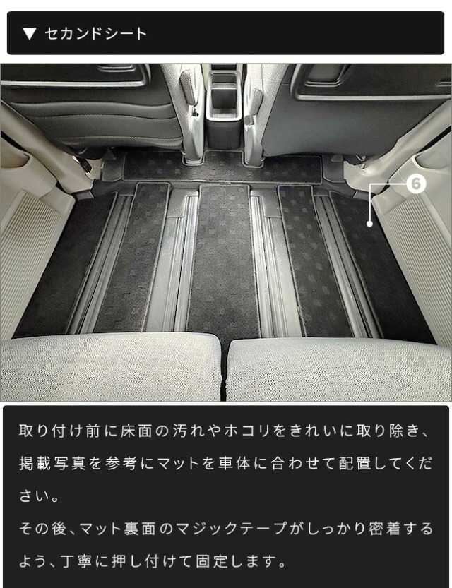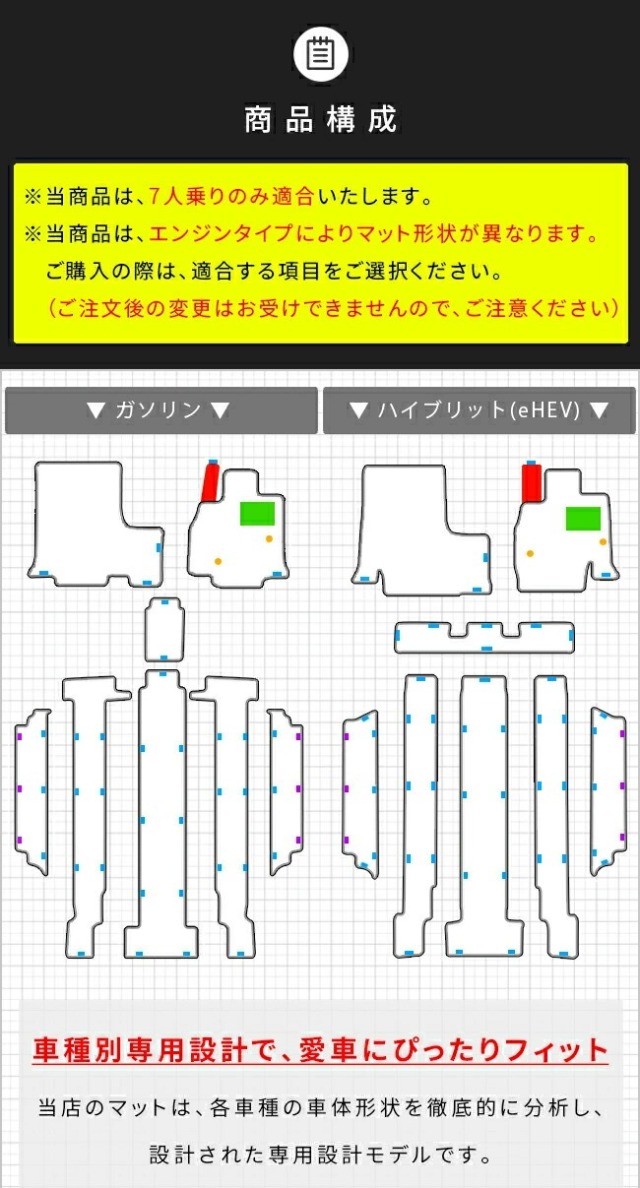 | 商品構成 | 専用フロアマット 8枚 止め具 2個 ※当商品は、7人乗りのみ適合いたします。 ※当商品は、エンジンタイプによりマット形状が異なります。ご購入の際は、適合する項目をご選択ください。(ご注文後の変更はお受けできませんので、ご注意ください) |