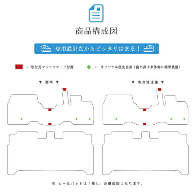 TOPカーマット全シリーズご紹介 STDシリーズ デイズ フロアマット STDマット B40系 日産 専用 車用アクセサリー カーマット 内装 カスタム 車用品 内装パーツ DAYZ 価格: ¥8,990 (税込) 販売期間: 年式: 選択してください 2022(R4)年9月~販売中 2020(R2)年8月~2022(R4)年8月 2019(H31)年3月~2020(R2)年7月 仕様: 選択してください 標準仕様 寒冷地仕様 カラー選択: 選択してください ブラック ブラウン ベージュ グレー マーブルベージュ マーブルグレー ヒールパッド: 選択してください マットと同系色 有り ( ブラック ) 有り ( ベージュ ) 有り ( グレー ) 有り ( ブラウン ) 有り ( ブルー ) 有り ( レッド ) 無し オーバーロックカラー: 選択してください マットと同系色 ホワイト ブラック サックス ブルー ネイビー レッド ピンク イエロー オレンジ ベージュ ダークブラウン マルーン グリーン モスグリーン シルバー ゴールド レビューを書いて特典プレゼント: 選択してください 書く:マルチクロス 書く:コースター 書かない:プレゼント不要 数量: 個 在庫: ○ 在庫 ○ 返品についての詳細はこちら 適合車種デイズ DAYZ年式:2019年(平成31)年3月~現行モデル型式 : B43W B44W B45W B46W B47W B48W ※ 2WD/4WD車にも対応しております。 部位フロア商品構成【専用フロアマット合計2枚】フロント用 1枚 リア用 1枚 STD シリーズフロアマット品質表示目付(g/m2)500素材(表)PP(ポリプロピレン)素材(裏)スパイクゴムPPの特徴は比重が軽く、保温性・速乾性に優れた高強度繊維です。 適合車種 デイズ DAYZ年式:2019年(平成31)年3月~現行モデル型式 : B43W B44W B45W B46W B47W B48W ※ 2WD/4WD車にも対応しております。 部位 フロア 商品構成 【専用フロアマット合計2枚】フロント用 1枚 リア用 1枚 ご購入前にお読みください。●送料について日本全国津々浦々全て無料にてお送りします。