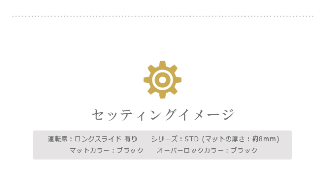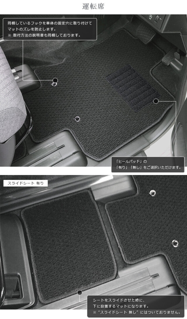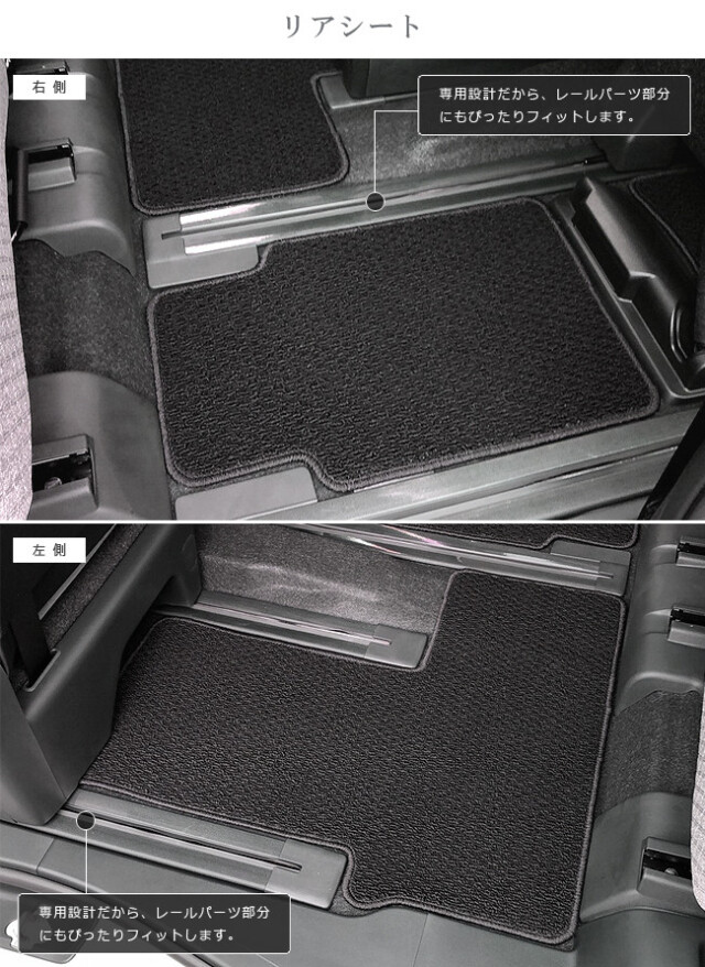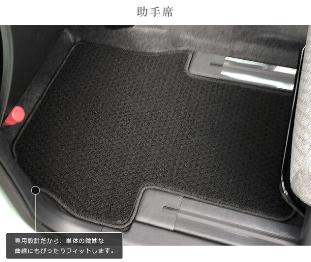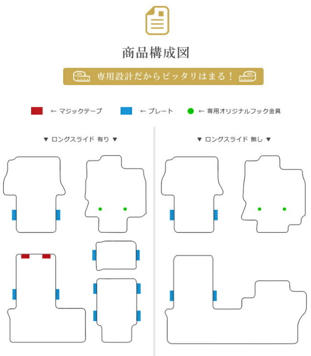 | 商品構成 | 運転席スライド有 専用フロアマット5枚 (フロント3枚 リアシート2枚) 運転席スライド無 専用フロアマット3枚 (フロント2枚 リアシート1枚) |