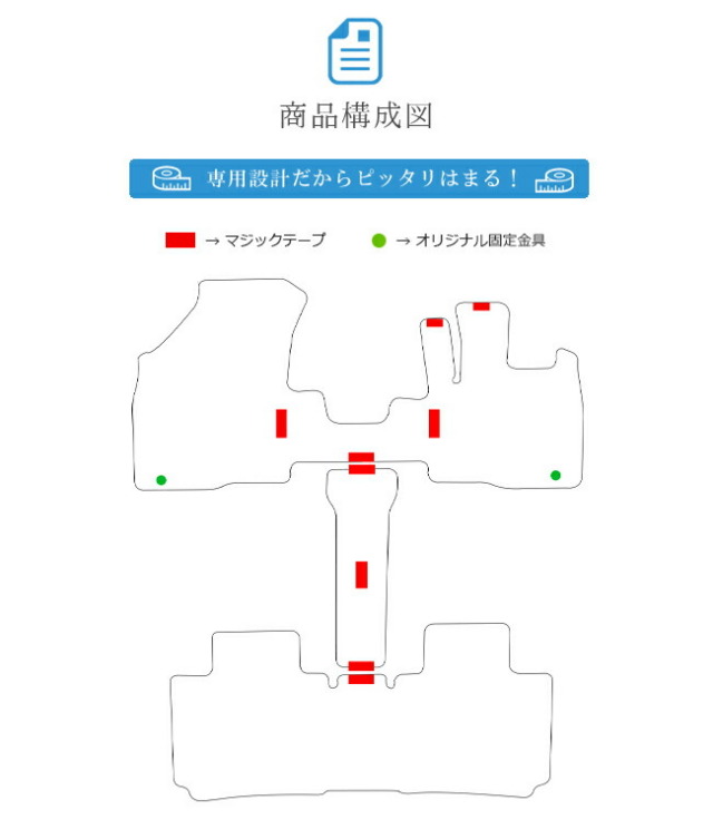 | 商品構成 | 専用フロアマット3枚(フロント 1枚 ウォークスルー 1枚 リア 1枚) |