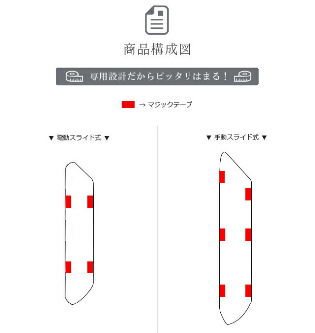 | 適合車種 | トヨタ ハイエースワゴン / TOYOTA HIACEWAGON 4ドアタイプ 片側スライド車用 年式:平成16年8月~現行モデル 型式:KDH200系 TRH200系 |