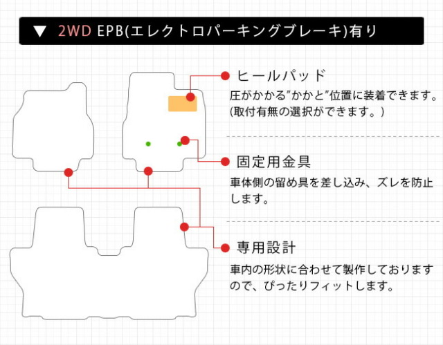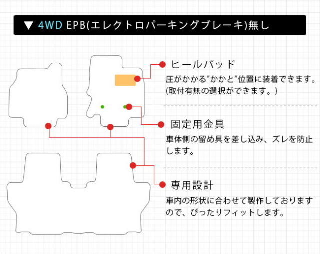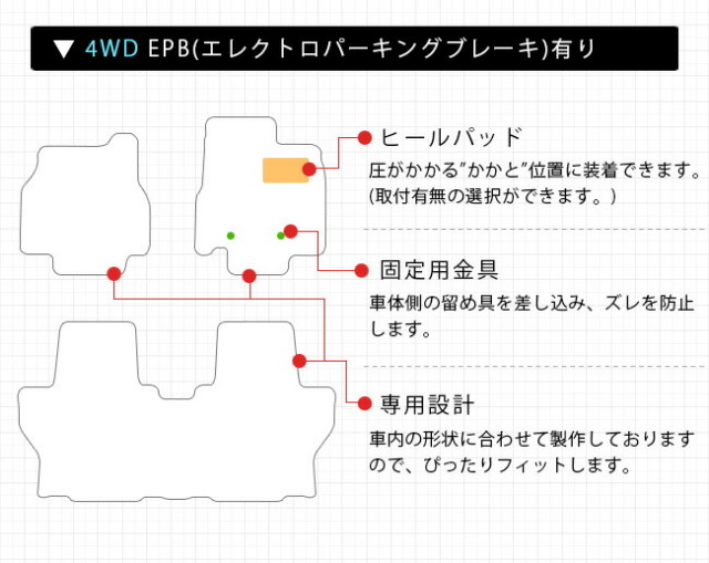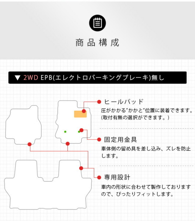 | 商品構成 | フロント用 2枚 (運転席・助手席) 後部座席用 1枚 ※ 駆動方式・EPB(エレクトロパーキングブレーキ)有無によりマットの形状が異なります。 |