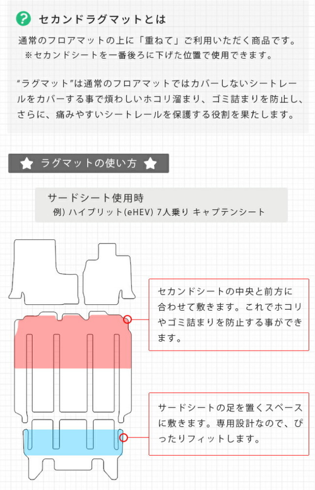 | 商品構成 | 専用ラグマット 2枚 ※ エンジンタイプによりマットの形状が異なります。 ※ 車いす仕様車・サイドリフトアップシート車には適合致しません。 |