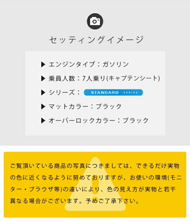 | 商品構成 | 専用ラグマット 2枚 ※ エンジンタイプによりマットの形状が異なります。 ※ 車いす仕様車・サイドリフトアップシート車には適合致しません。 |