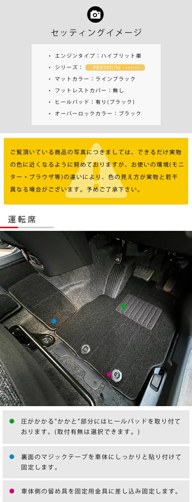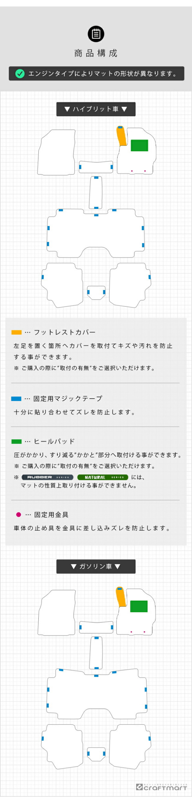 | 適合車種 | トヨタ シエンタ 年式:2022(令和4)年8月~現行モデル 形式:MXPC10G MXPL10G MXPL15G ※エンジンタイプによりマットの形状が異なります。ご購入の際は、適合するタイプをご選択くださいませ。 |