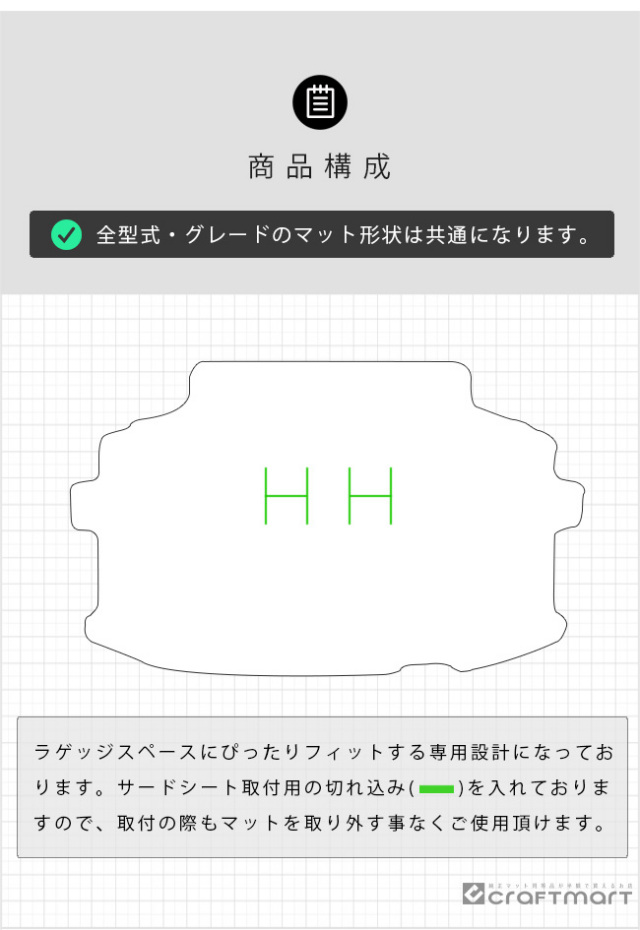 | 適合車種 | トヨタ シエンタ 年式:2022(令和4)年8月~現行モデル 形式:MXPC10G MXPL10G MXPL15G ※全型式・グレードのマット形状は共通になります。 |