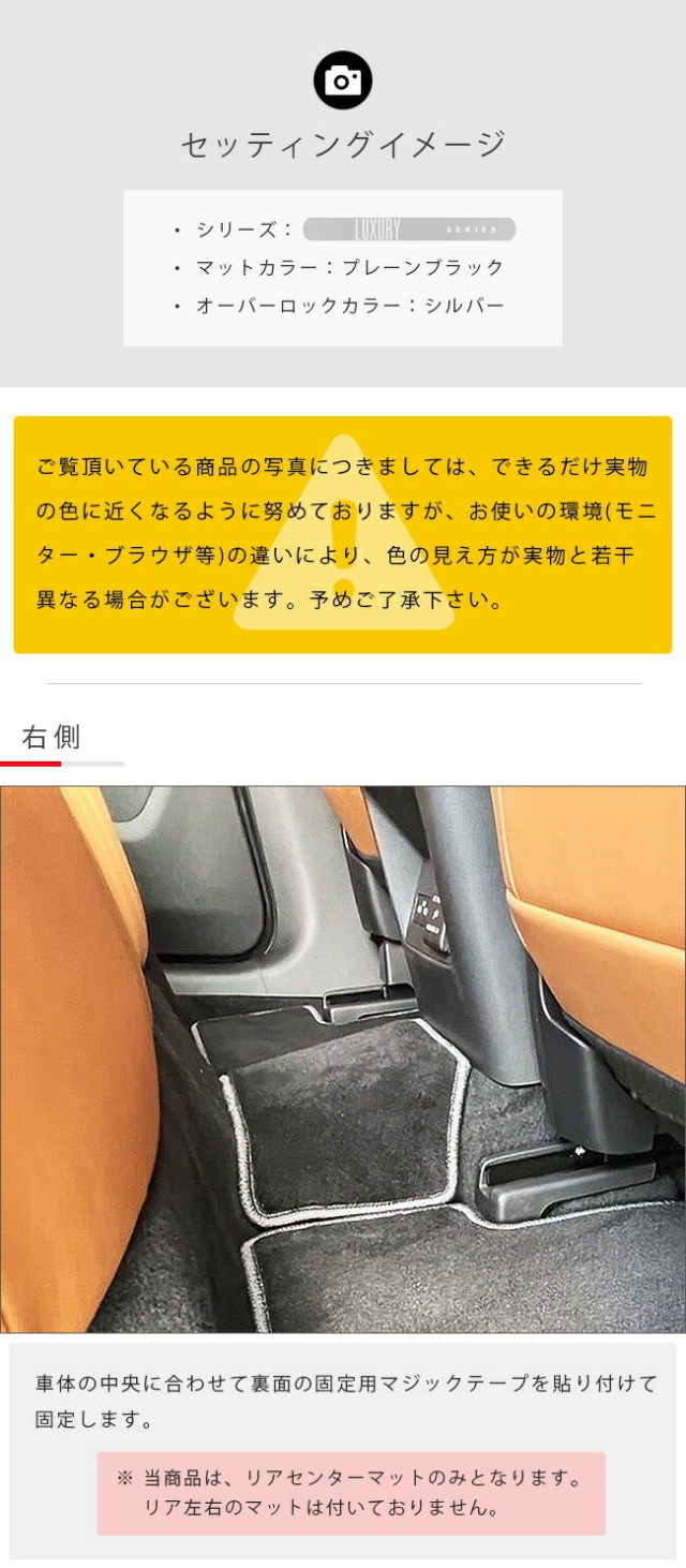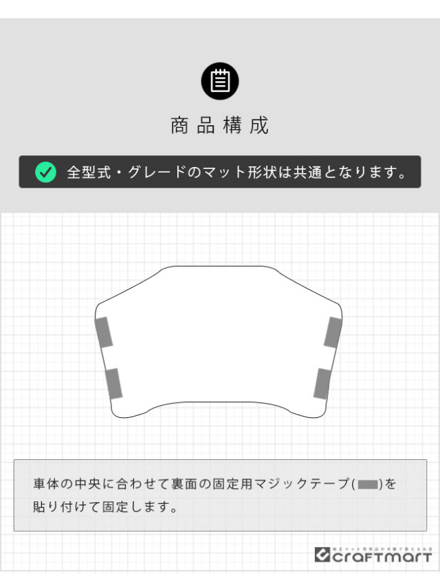 | 商品構成 | リアセンターマット 1枚 ※ マットの形状は、全グレード・型式共通になります。 |