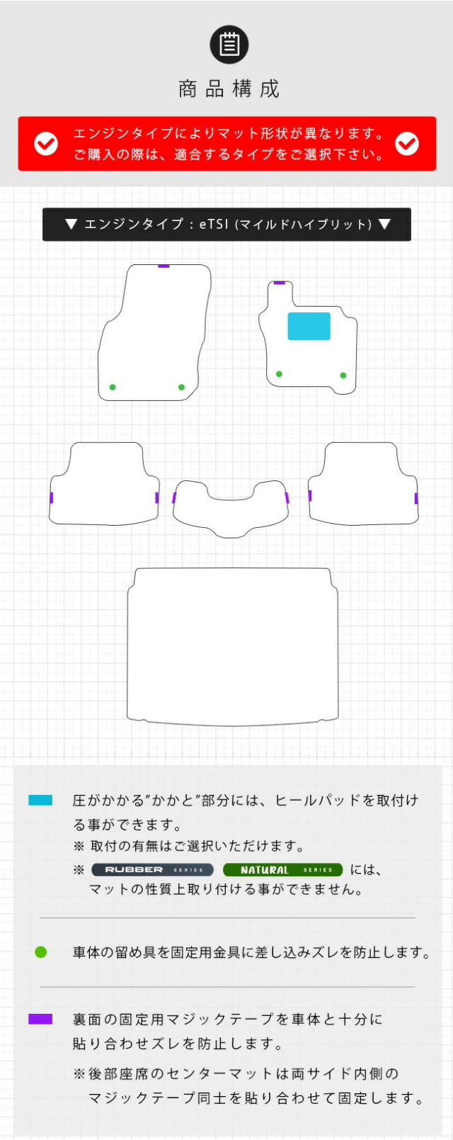 | 商品構成 | ・専用フロアマット 5枚 ┗ 運転席 1枚 ┗ 助手席 1枚 ┗ 後部座席 3枚 ・専用ラゲッジマット 1枚 ※ エンジンタイプによりマット形状が異なります。ご購入の際は、適合するタイプをご選択下さい。 |