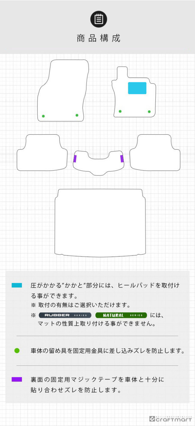 | 商品構成 | ・専用フロアマット 5枚 ┗ 運転席 1枚 ┗ 助手席 1枚 ┗ 後部座席 3枚 ・専用ラゲッジマット 1枚 |