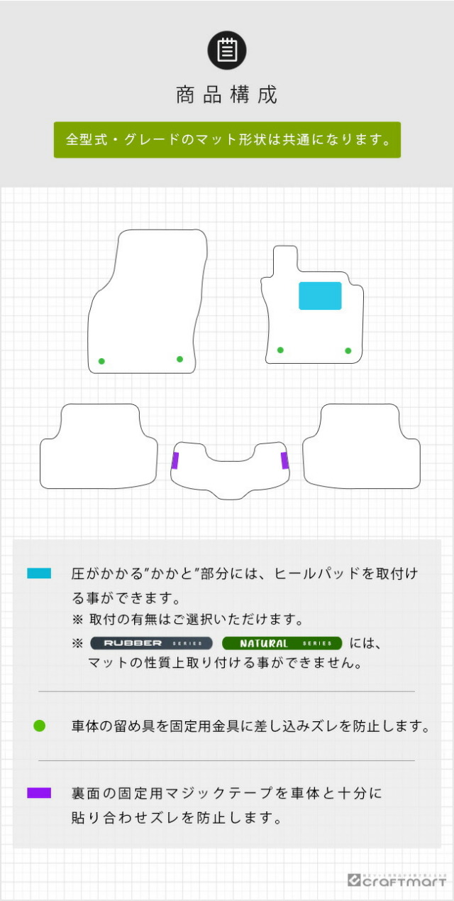 | 商品構成 | ・専用フロアマット 5枚 ┗ 運転席 1枚 ┗ 助手席 1枚 ┗ 後部座席 3枚 |