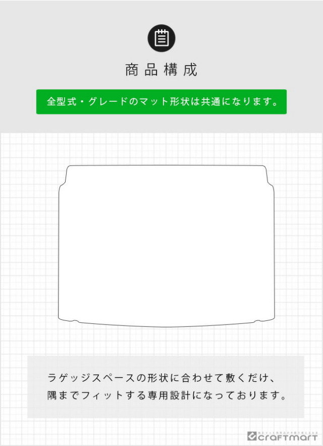 | 商品構成 | 専用ラゲッジマット 1枚 ※ 全型式・グレードのマット形状は共通になります。 |