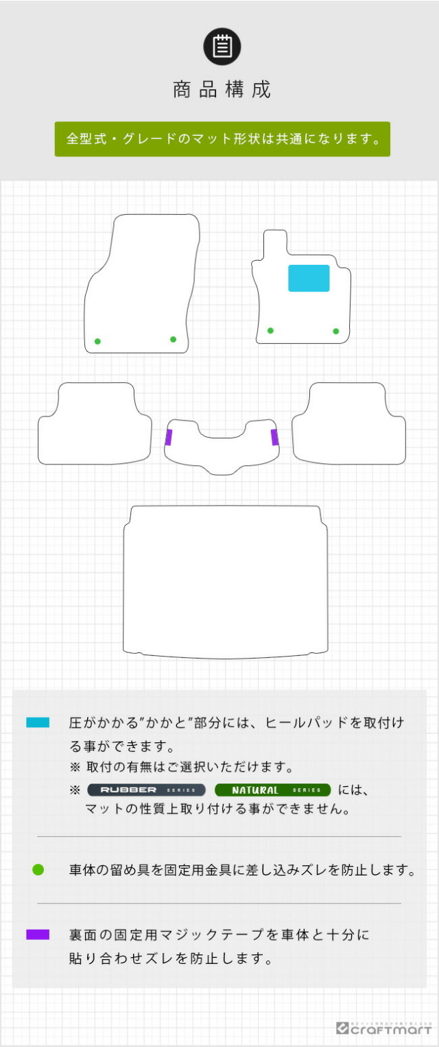 | 商品構成 | ・専用フロアマット 5枚 ┗ 運転席 1枚 ┗ 助手席 1枚 ┗ 後部座席 3枚 ・専用ラゲッジマット 1枚 |