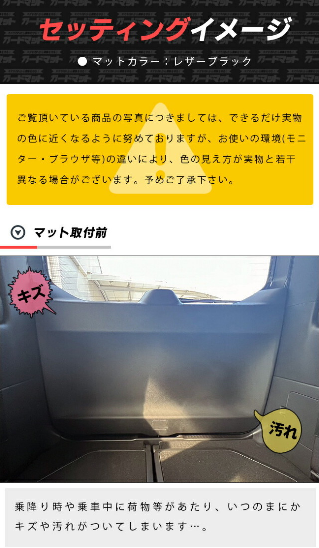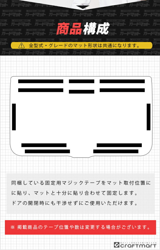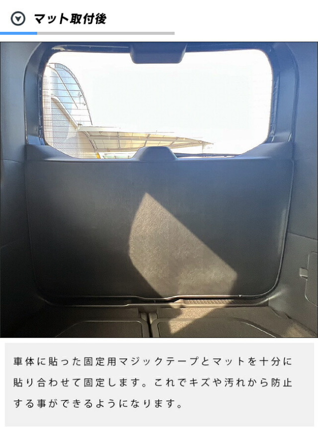 | 商品構成 | バックドアトリム用 ガードマット 1枚 ※ 固定用マジックテープを同梱しております。 |