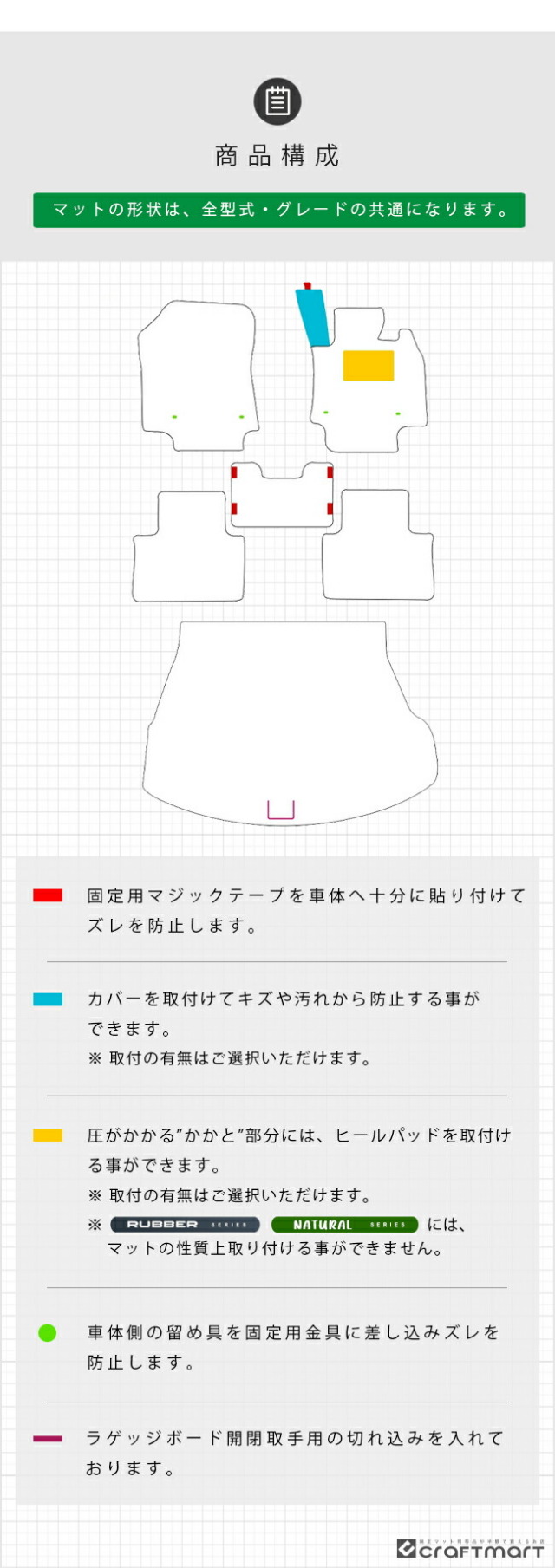 | 商品構成 | 専用フロアマットセット 6枚 運転席 1枚 助手席 1枚 後部座席 3枚 荷室 1枚 |