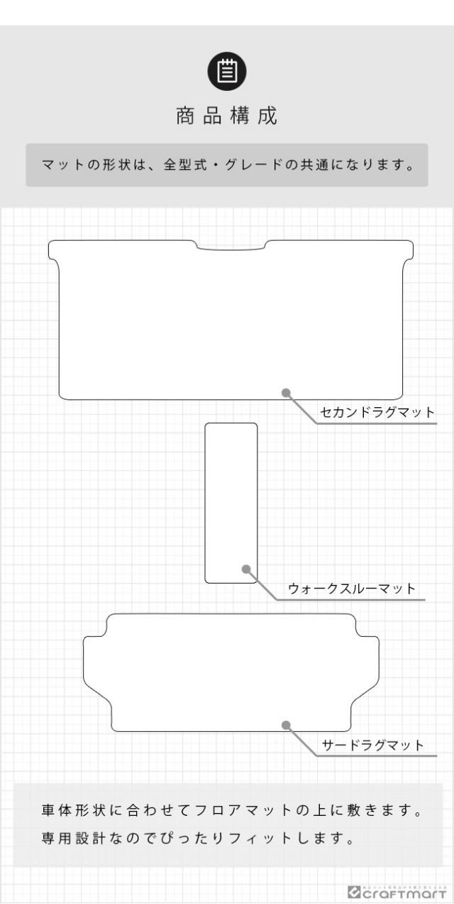 | 商品構成 | セカンドラグマット 1枚 ウォークスルーマット 1枚 サードラグマット 1枚 ※ メンテナンス書を同封しております。 |