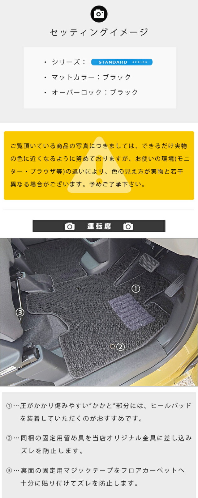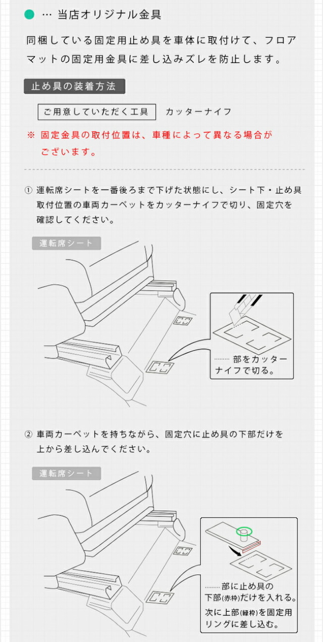| 商品構成 | ● 専用フロアマット 計3枚 ┗ 運転席用 1枚 ┗ 助手席用 1枚 ┗ 後部座席用 1枚 ※ 同梱:固定用金具 2個 ※ 当店専用固定金具ですので、純正固定具には対応しておりません。 |