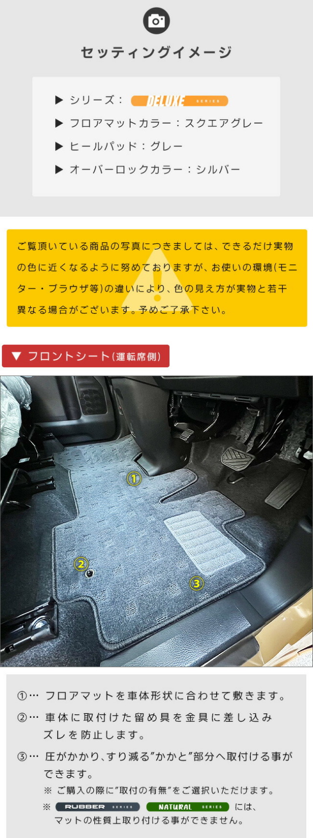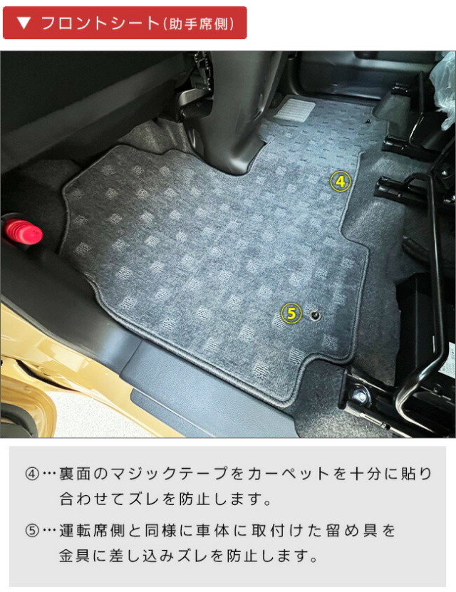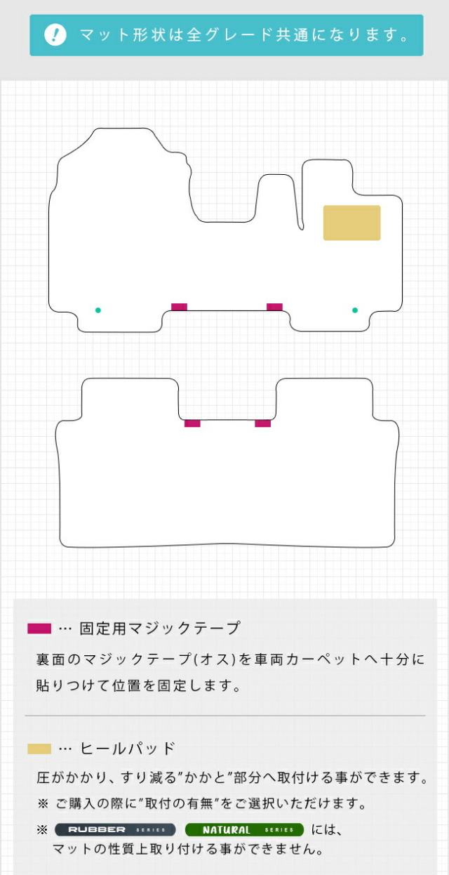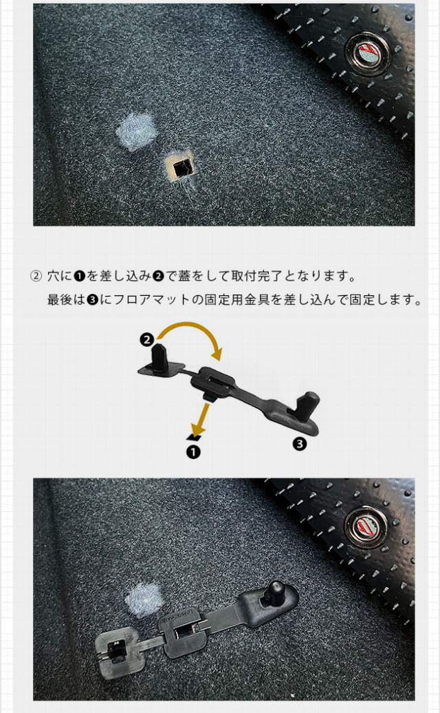 | 商品構成 | 専用フロアマット合計2枚 ・フロント用1枚 ・リア用1枚 ・当店オリジナル金具2個 |