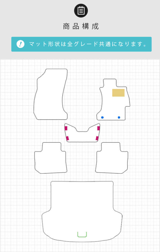 | 商品構成 | 専用フロアマット5枚(運転席 1枚 助手席 1枚 後部座席 3枚) 専用ラゲッジマット1枚 |