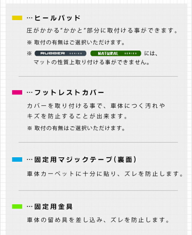 | 商品構成 | 運転席用フロアマット 1枚 助手席用フロアマット 1枚 後部座席用フロアマット 3枚 ※ 「年式」「ダブルツィーターシステムの有無」によりマット形状が異なります。ご購入の際は、其々適合する項目をご選択くださいませ。 |