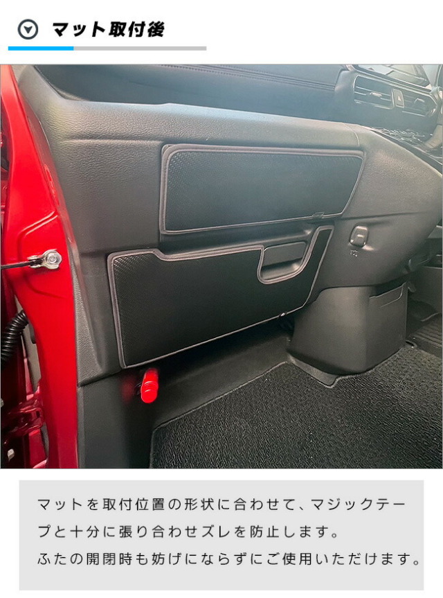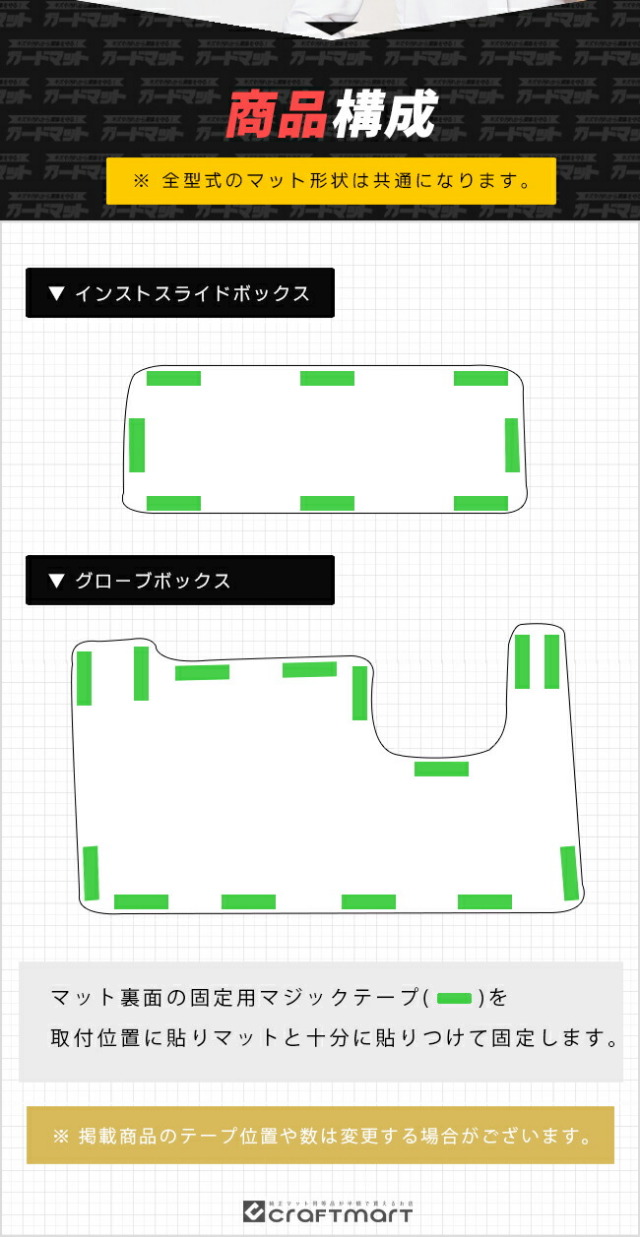 | 商品構成 | インストスライドボックス用ガードマット 1枚 グローブボックス用ガードマット 1枚 |