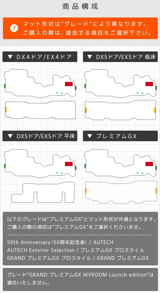 | 適合グレード | マット形状は”グレード”により異なります。ご購入の際は、適合する項目をご選択下さい。 DX4ドア/EX4ドア DX5ドア/EX5ドア 低床 DX5ドア/EX5ドア 平床 プレミアムGX 50th Anniversary(50周年記念車) AUTECH AUTECH Exterior Selection プレミアムGX プロスタイル GRAND プレミアムGX プロスタイル GRAND プレミアムGX ※ ”GRAND プレミアムGX MYROOM Launch edition”は適合いたしません。 |