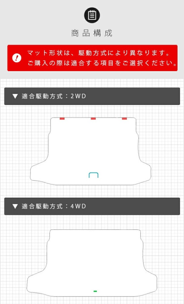 | 商品構成 | ・専用フロアマット 5枚 ※ フロアマット形状は、グレードにより異なります。ご購入の際は適合する項目をご選択ください。 ・専用ラゲッジマット 1枚 ※ ラゲッジマット形状は、駆動方式により異なります。ご購入の際は適合する項目をご選択ください。 |