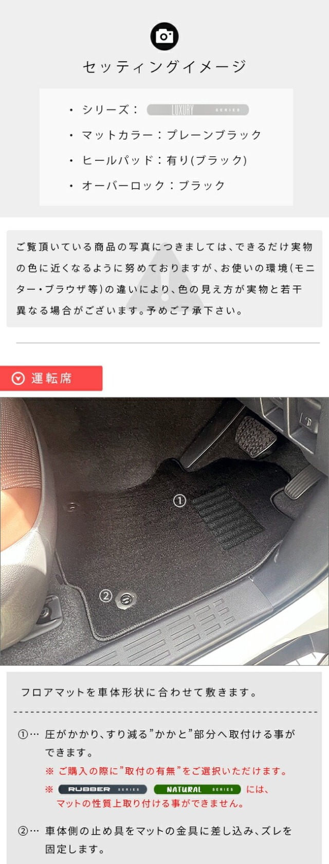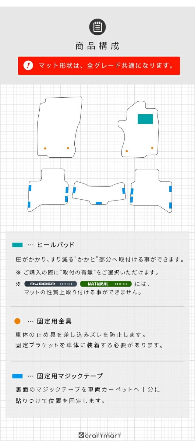TOPカーマット全シリーズご紹介 PMシリーズ トヨタ ランドクルーザー 250 5人乗り フロアマット PMシリーズ 新型 専用 アクセサリー 内装 カスタム パーツ 価格: ¥21,120 (税込) 販売期間: カラーバリエーション: 選択してください ラインブラック ラインベージュ ファーブラック ヒールパッド: 選択してください マットと同系色 有り ( ブラック ) 有り ( ベージュ ) 有り ( グレー ) 有り ( ブラウン ) 有り ( ブルー ) 有り ( レッド ) 無し オーバーロックカラー: 選択してください マットと同系色 ホワイト ブラック サックス ブルー ネイビー レッド ピンク イエロー オレンジ ベージュ ダークブラウン マルーン グリーン モスグリーン シルバー ゴールド レビューを書いて特典プレゼント: 選択してください 書く:マルチクロス 書く:コースター 書かない:プレゼント不要 数量: 個 在庫: ○ 在庫 ○ 返品についての詳細はこちら 適合車種トヨタ ランドクルーザー適合年式2024(令和6)年4月〜※ 適合年式以外のご使用はお控えください。適合型式TRJ250WGDJ250W※ 適合型式以外のご使用はお控えください。商品構成運転席用フロアマット 1枚助手席用フロアマット 1枚セカンドシート用フロアマット 3枚適合乗員人数5人乗り確認事項納期につきましては弊社からのメールをご確認くださいませ。 適合車種名 トヨタ ランドクルーザー 適合年式 2024(令和6)年4月〜※ 適合年式以外のご使用はお控えください。 適合型式 TRJ250WGDJ250W※ 適合型式以外のご使用はお控えください。 商品構成 運転席用フロアマット 1枚助手席用フロアマット 1枚セカンドシート用フロアマット 3枚 適合乗員人数 5人乗り 確認事項 納期につきましては弊社からのメールをご確認くださいませ。