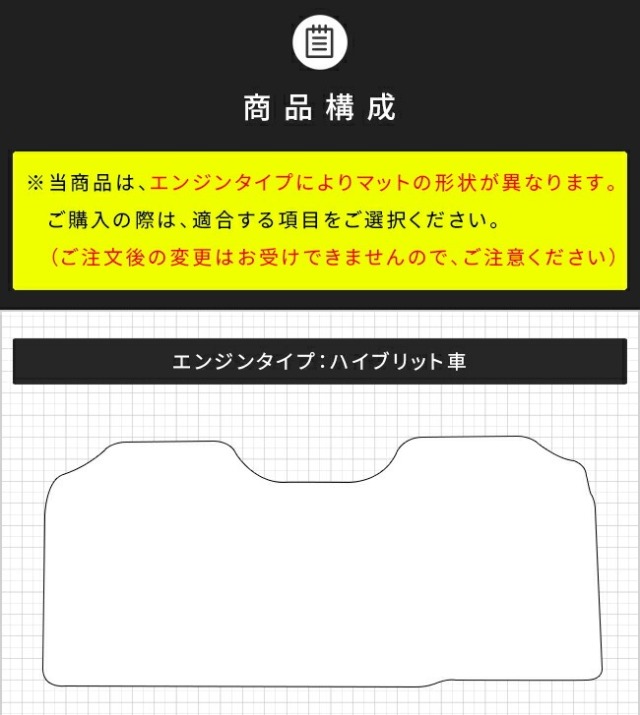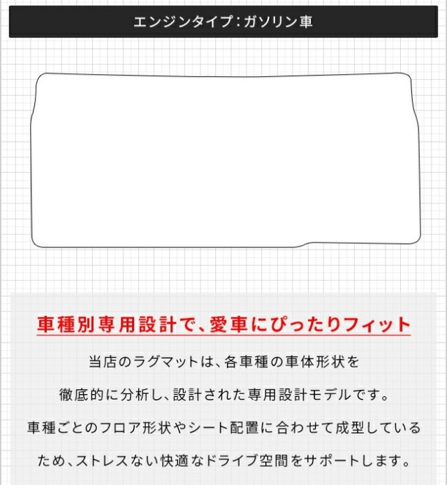 | 商品構成 | 専用セカンドラグマット 1枚 ※当商品は、エンジンタイプによりマットの形状が異なります。ご購入の際は、適合する項目をご選択ください。(ご注文後の変更はお受けできませんので、ご注意ください) |