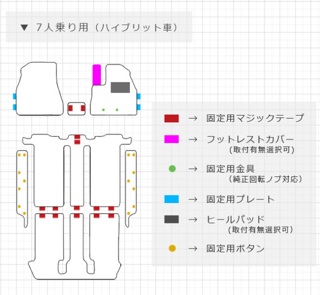 | 商品構成 | フロント用 2枚 (運転席・助手席) ウォークスルー用 1枚 セカンドシート用 1枚 サイドステップ用 2枚(左右毎各1枚) サードシート用 1枚 ※ ”フロアマット”の形状は、乗員人数・エンジンタイプにより異なります。 |